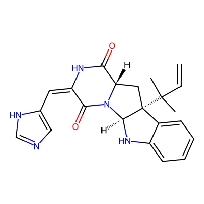 | CCSBASE_73DE8EA71F | Roquefortine C | [M+H]+ | 390.1925 | 179.0 | CC(C)(C=C)[C@@]12C[C@H]3C(=O)N/C(=C/C4=CN=CN4)/C(=O)N3[C@@H]1NC5=CC=CC=C25 | Organoheterocyclic compounds | 1 | 14 | TW | calibrated with polyalanine | |