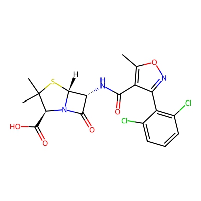 | CCSBASE_5156F0719C | DICLOXACILLIN | [M+H]+ | 470.0339 | 197.0 | CC1=C(C(=NO1)C2=C(C=CC=C2Cl)Cl)C(=O)N[C@H]3[C@@H]4N(C3=O)[C@H](C(S4)(C)C)C(=O)O | Organic acids and derivatives | 1 | 15 | TW | calibrated with Waters Major Mix | |
