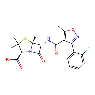 | CCSBASE_8E0156643C | CLOXACILLIN | [M+H]+ | 436.0728 | 193.8 | CC1=C(C(=NO1)C2=CC=CC=C2Cl)C(=O)N[C@H]3[C@@H]4N(C3=O)[C@H](C(S4)(C)C)C(=O)O | Organic acids and derivatives | 1 | 15 | TW | calibrated with Waters Major Mix | |