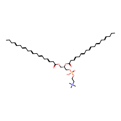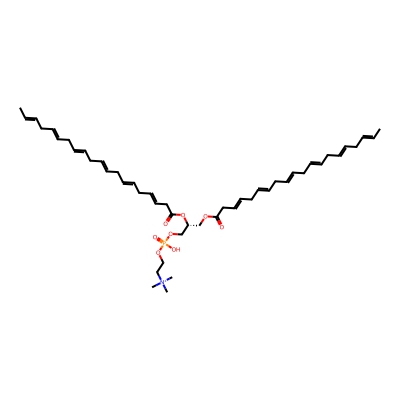 | CCSBASE_EC397BFF98 | PC(40:12) | [M+Na]+ | 844.49 | 300.6 | CC=CCC=CCC=CCC=CCC=CCC=CCC(=O)OC[C@H](COP(=O)(O)OCC[N+](C)(C)C)OC(=O)CC=CCC=CCC=CCC=CCC=CCC=CC | Lipids and lipid-like molecules | 1 | 1 | DT | stepped-field | |