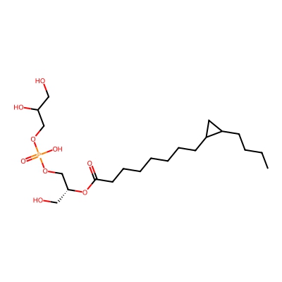| CCSBASE_F12972DAC2 | LPG(15:1) | [M-H]- | 467.2422 | 206.44 | CCCCC1CC1CCCCCCCC(=O)O[C@H](CO)COP(=O)(O)OCC(CO)O | None | -1 | 17 | TW | calibrated with phosphatidylcholines (ESI+) and phosphatidylethanolamines (ESI-), doubly charged cardiolipins calibrated with poly-DL-alanine | |