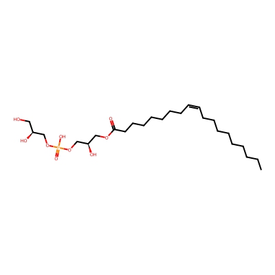 | CCSBASE_C337342532 | LPG(18:1) | [M-H]- | 509.2874 | 217.72 | CCCCCCCC/C=C\CCCCCCCC(=O)OC[C@H](COP(=O)(O)OC[C@H](CO)O)O | Lipids and lipid-like molecules | -1 | 17 | TW | calibrated with phosphatidylcholines (ESI+) and phosphatidylethanolamines (ESI-), doubly charged cardiolipins calibrated with poly-DL-alanine | |