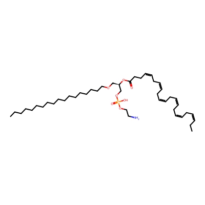 | CCSBASE_6CAE4C1781 | PE(o40:06) | [M+2Na-H]+ | 822.5357 | 288.19 | CCCCCCCCCCCCCCCCCCOC[C@H](COP(=O)(O)OCCN)OC(=O)CC/C=C\C/C=C\C/C=C\C/C=C\C/C=C\C/C=C\CC | Lipids and lipid-like molecules | 1 | 18 | DT | stepped-field | |