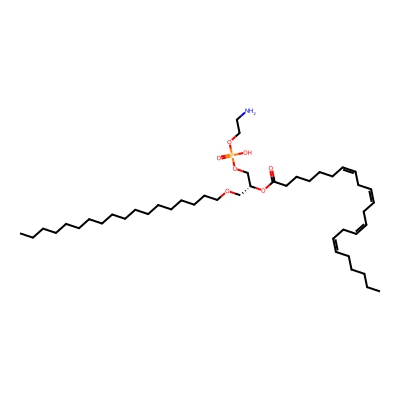 | CCSBASE_FDDA8DA94C | PE(o40:04) | [M+2Na-H]+ | 826.5675 | 293.52 | CCCCCCCCCCCCCCCCCCOC[C@H](COP(=O)(O)OCCN)OC(=O)CCCCC/C=C\C/C=C\C/C=C\C/C=C\CCCCC | Lipids and lipid-like molecules | 1 | 18 | DT | stepped-field | |