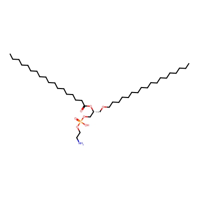 | CCSBASE_B6BDAA9D98 | PE(o38:02) | [M+2Na-H]+ | 802.5709 | 289.33 | CCCCCCCCCCCCCCCCCCCCOC[C@H](COP(=O)(O)OCCN)OC(=O)CCCCCCC/C=C\C/C=C\CCCCC | None | 1 | 18 | DT | stepped-field | |