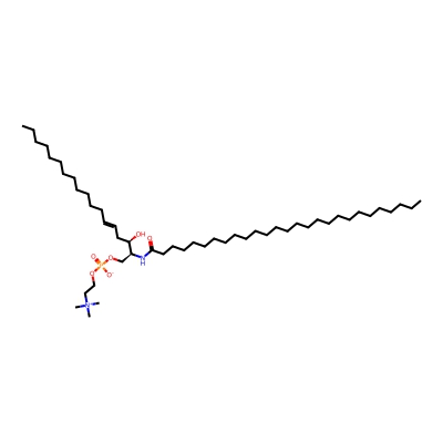 | CCSBASE_2A6F7BD553 | SM(43:1) | [M+H]+ | 829.7235 | 308.58 | CCCCCCCCCCCCCCCCCCCCCCCCC(=O)N[C@@H](COP(=O)([O-])OCC[N+](C)(C)C)[C@@H](CC=CCCCCCCCCCCCC)O | Lipids and lipid-like molecules | 1 | 19 | DT | single field | |