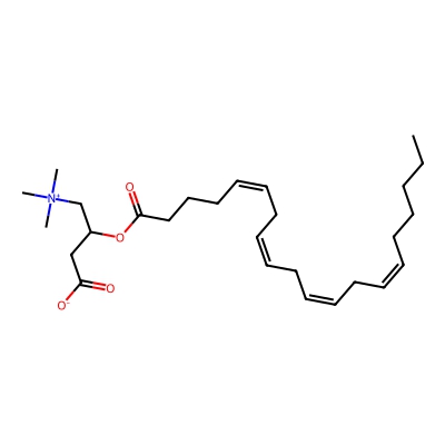 | CCSBASE_686382C741 | CAR(20:4) | [M]+ | 448.343 | 215.59 | CCCCC/C=C\C/C=C\C/C=C\C/C=C\CCCC(=O)OC(CC(=O)[O-])C[N+](C)(C)C | Lipids and lipid-like molecules | 1 | 20 | TIMS | single field, calibrated | |