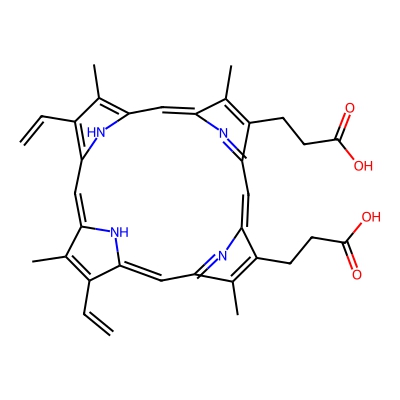 | CCSBASE_464E2419E4 | Protoporphyrin IX | [M+H]+ | 563.2658 | 241.4 | CC1=C(C2=CC3=NC(=CC4=NC(=CC5=C(C(=C(N5)C=C1N2)C=C)C)C(=C4CCC(=O)O)C)C(=C3C)CCC(=O)O)C=C | Organoheterocyclic compounds | 1 | 4 | DT | single field, calibrated with Agilent tune mix (Agilent) | |
