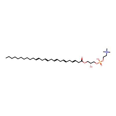 | CCSBASE_012B09CDC0 | LPC(24:4) | [M+H]+ | 600.402 | 244.01 | CCCCCCCCCCCC=CCC=CCC=CCC=CCC(=O)OC[C@H](COP(=O)(O)OCC[N+](C)(C)C)O | Lipids and lipid-like molecules | 1 | 20 | TIMS | single field, calibrated | |