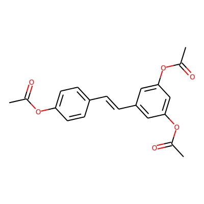 | CCSBASE_F1430941A0 | Triacetylresveratrol | [M+H-H2O]+ | 337.1075 | 174.3 | CC(=O)OC1=CC=C(C=C1)/C=C/C2=CC(=CC(=C2)OC(=O)C)OC(=O)C | small molecule | 1 | 26 | DT | single field, calibrated | |
