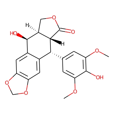 | CCSBASE_5A4D5E8117 | 4'-demethylepipodophyllotoxin | [M+H-H2O]+ | 383.113 | 183.7 | COC1=CC(=CC(=C1O)OC)[C@H]2[C@@H]3[C@H](COC3=O)[C@@H](C4=CC5=C(C=C24)OCO5)O | small molecule | 1 | 26 | DT | single field, calibrated | |