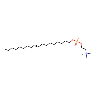 | CCSBASE_21F9E6104E | Elaidylphosphocholine | [M+H]+ | 434.3399 | 215.2 | CCCCCCCC/C=C/CCCCCCCCOP(=O)([O-])OCC[N+](C)(C)C | small molecule | 1 | 26 | DT | single field, calibrated | |