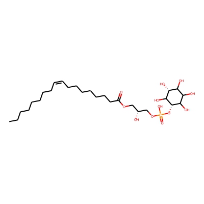 | CCSBASE_32C07B599B | LPI(18:1) | [M-H]- | 597.3044199999999 | 233.4 | [C@]([H])(O)(COP(=O)(O)O[C@@H]1C(O)[C@H](O)C(O)C(O)C1O)COC(CCCCCCC/C=C\CCCCCCCC)=O | lipid | 1 | 3 | DT | stepped-field |