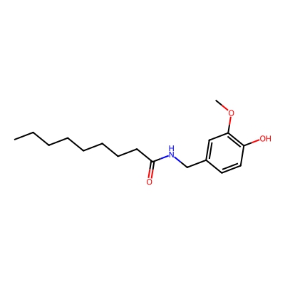 | CCSBASE_3251311e26765855f0d7c4f6b2ca8210 | Nonivamide | [M-H]- | 292.1918 | 0.87 | 180.36 | CCCCCCCCC(=O)NCC1=CC(=C(C=C1)O)OC | Benzenoids | -1 | 1 | TW | polyala | ||