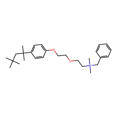 | CCSBASE_e23c5bbec4d363efb7705f75ea9fe00d | Benzethonium chloride | [M]+ | 412.321 | 0.89 | 209.11 | CC(C)(C)CC(C)(C)C1=CC=C(C=C1)OCCOCC[N+](C)(C)CC2=CC=CC=C2 | Benzenoids | 1 | 1 | TW | polyala |