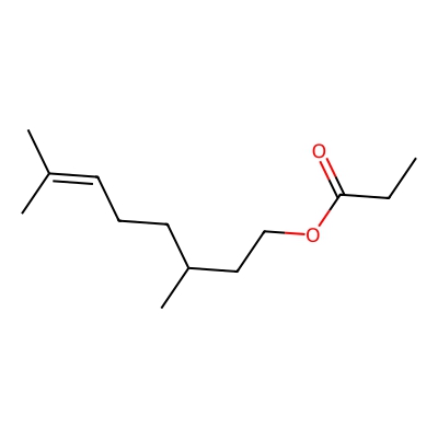 | CCSBASE_7587a1a16354d3ae7a407d5144a6e005 | Citronellyl propionate | [M-H-H2O]- | 193.1592 | 0.88 | 152.36 | CCC(=O)OCCC(C)CCC=C(C)C | Lipids and lipid-like molecules | -1 | 1 | TW | polyala | ||