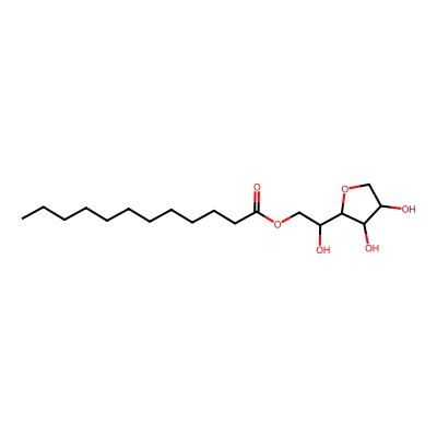 | CCSBASE_218556e769636f896f8a9de38d9bf833 | Sorbitan monododecanoate | [M-H]- | 345.2283 | 0.95 | 189.45 | CCCCCCCCCCCC(=O)OCC(C1C(C(CO1)O)O)O | Lipids and lipid-like molecules | -1 | 1 | TW | polyala | ||