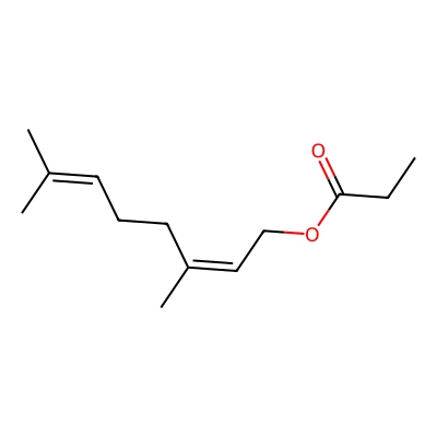 | CCSBASE_f4bd6961b5a0bbb792eb474aac91b98f | Geranyl propionate | [M-H]- | 209.1547 | 0.83 | 158.46 | CCC(=O)OCC=C(C)CCC=C(C)C | Lipids and lipid-like molecules | -1 | 1 | TW | polyala | ||