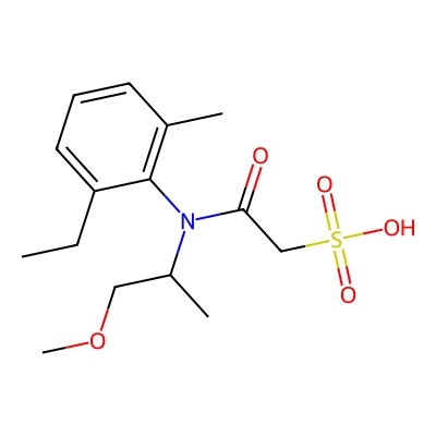 | CCSBASE_113bd88aec47d2e48780c249ca789710 | Metolachlor ESA | [M-H]- | 328.1224 | 0.87 | 174.75 | CCC1=CC=CC(=C1N(C(C)COC)C(=O)CS(=O)(=O)O)C | Benzenoids | -1 | 1 | TW | polyala | ||
