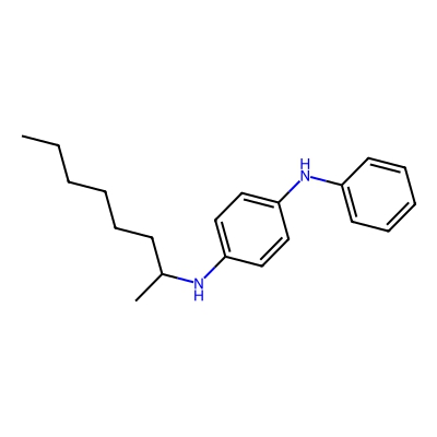 | CCSBASE_d49d8e2c12003ae323b36e62efde7042 | N-(1-Methylheptyl)-N'-phenyl-1,4-benzenediamine | [M+H]+ | 297.2325 | 0.85 | 185.78 | CCCCCCC(C)NC1=CC=C(C=C1)NC2=CC=CC=C2 | Organic nitrogen compounds | 1 | 1 | TW | polyala | ||