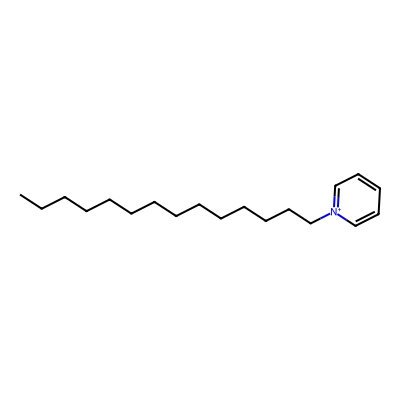 | CCSBASE_f91caf0bd29d01725bdc01c545d917bb | Tetradecylpyridinium bromide | [M]+ | 276.2686 | 0.88 | 186.79 | CCCCCCCCCCCCCC[N+]1=CC=CC=C1 | Organoheterocyclic compounds | 1 | 1 | TW | polyala | ||