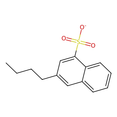 | CCSBASE_1d009a6fb71fcaaff1009b22f62f6b87 | Butylnaphthalenesulfonic acid sodium salt | [M-H]- | 263.0747 | 0.94 | 166.95 | CCCCC1=CC2=CC=CC=C2C(=C1)S(=O)(=O)[O-] | Lipids and lipid-like molecules | -1 | 1 | TW | polyala | ||