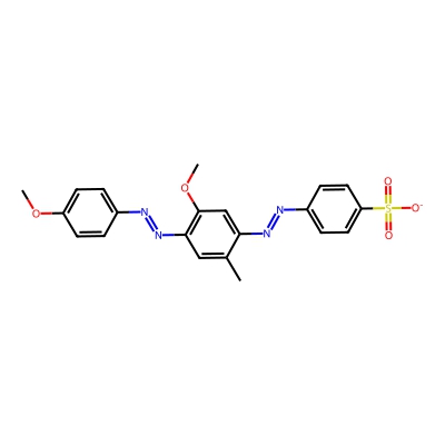 | CCSBASE_d6df0a1a9e70ebd3f4618af617d156ee | Acid Orange 156 | [M+Na]+ | 463.1047 | 1.05 | 231.24 | CC1=CC(=C(C=C1N=NC2=CC=C(C=C2)S(=O)(=O)[O-])OC)N=NC3=CC=C(C=C3)OC | Organoheterocyclic compounds | 1 | 1 | TW | polyala | ||