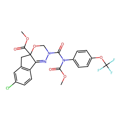 | CCSBASE_1a174a1d08172049fadf66a8e7511ffc | Indoxacarb | [M+H]+ | 528.078 | 0.98 | 203.13 | COC(=O)C12CC3=C(C1=NN(CO2)C(=O)N(C4=CC=C(C=C4)OC(F)(F)F)C(=O)OC)C=CC(=C3)Cl | Benzenoids | 1 | 1 | TW | polyala | ||