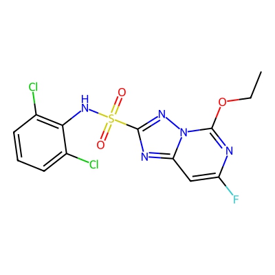 | CCSBASE_61c56459606ea36b987348464aa771e2 | Diclosulam | [M-H]- | 403.9792 | 0.79 | 183.13 | CCOC1=NC(=CC2=NC(=NN21)S(=O)(=O)NC3=C(C=CC=C3Cl)Cl)F | Benzenoids | -1 | 1 | TW | polyala | ||
