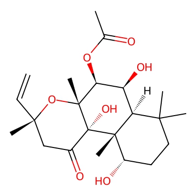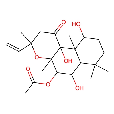 | CCSBASE_4f9e9bea57af3250a669bca9cdc78a4c | Forskolin | [M-H]- | 409.2232 | 0.86 | 194.3 | CC(=O)OC1C(C2C(CCC(C2(C3(C1(OC(CC3=O)(C)C=C)C)O)C)O)(C)C)O | Lipids and lipid-like molecules | -1 | 1 | TW | polyala | ||