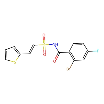 | CCSBASE_4cd1004e5d322451ef92f1eea9f81a79 | PharmaGSID_48518 | [M+Na]+ | 411.9083 | 0.86 | 184.88 | C1=CSC(=C1)C=CS(=O)(=O)NC(=O)C2=C(C=C(C=C2)F)Br | Benzenoids | 1 | 1 | TW | polyala | ||