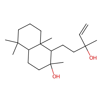 | CCSBASE_cf82ee562897a8129cc76e62db44de37 | Sclareol | [M+Na]+ | 331.2607 | 1.02 | 185.73 | CC1(CCCC2(C1CCC(C2CCC(C)(C=C)O)(C)O)C)C | Lipids and lipid-like molecules | 1 | 1 | TW | polyala | ||