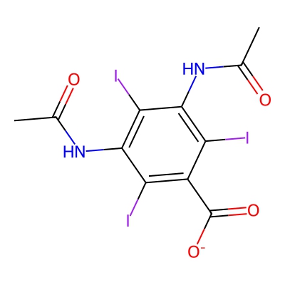 | CCSBASE_3ef16ecf8e0da7123b876e995bdd17d2 | Diatrizoate sodium | [M-H-H2O]- | 594.7513 | 0.69 | 177.1 | CC(=O)NC1=C(C(=C(C(=C1I)C(=O)[O-])I)NC(=O)C)I | Benzenoids | -1 | 1 | TW | polyala | ||