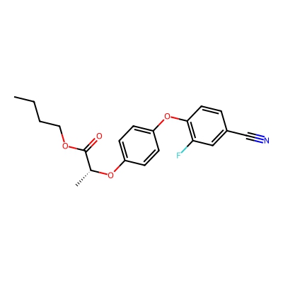 | CCSBASE_94b8b4155dd0ff256625e4d3aebe3266 | Cyhalofop-butyl | [M+Na]+ | 380.1269 | 1.0 | 196.08 | CCCCOC(=O)[C@@H](C)OC1=CC=C(C=C1)OC2=C(C=C(C=C2)C#N)F | Benzenoids | 1 | 1 | TW | polyala | ||