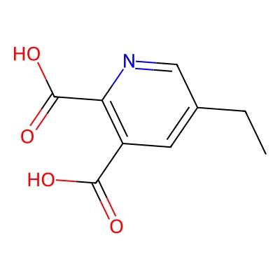 | CCSBASE_c61061777c46e9f5146b29785abd00e0 | 5-Ethyl-2,3-pyridinedicarboxylic acid | [M+H-H2O]+ | 178.05 | 0.74 | 134.86 | CCC1=CC(=C(N=C1)C(=O)O)C(=O)O | Organoheterocyclic compounds | 1 | 1 | TW | polyala | ||
