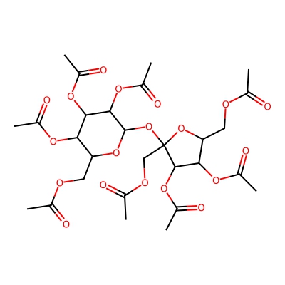 | CCSBASE_c732eb2f0e68a89dd6af05b65784fba7 | Sucrose octaacetate | [M+K]+ | 717.1639 | 0.87 | 234.97 | CC(=O)OCC1C(C(C(C(O1)OC2(C(C(C(O2)COC(=O)C)OC(=O)C)OC(=O)C)COC(=O)C)OC(=O)C)OC(=O)C)OC(=O)C | Organic oxygen compounds | 1 | 1 | TW | polyala | ||