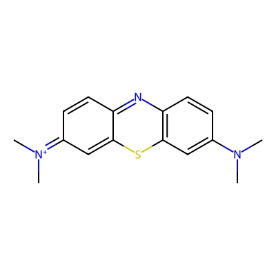 | CCSBASE_9e87a0214875639aa062185a5497e518 | Methylene blue | [M]+ | 284.1216 | 0.6 | 163.58 | CN(C)C1=CC2=C(C=C1)N=C3C=CC(=[N+](C)C)C=C3S2 | Organoheterocyclic compounds | 1 | 1 | TW | polyala | ||