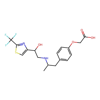 | CCSBASE_5f897f7e8bf3f5b8af247753034d4d09 | CP-114271 | [M-H]- | 403.0945 | 0.73 | 185.57 | CC(CC1=CC=C(C=C1)OCC(=O)O)NCC(C2=CSC(=N2)C(F)(F)F)O | Benzenoids | -1 | 1 | TW | polyala | ||